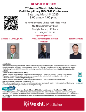 7th Annual WashU Medicine Multidisciplinary IBD CME Conference Mar 08, 2025 8:00 a.m.-4:00 p.m. Add to: Google Calendar | Outlook | iCal File