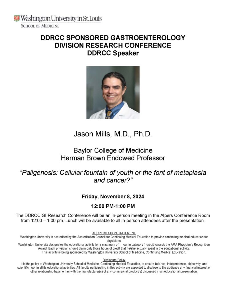 DDRCC Sponsored Gastroenterology Division Research Conference Nov 08, 2024 12:00 p.m.-1:00 p.m. DDRCC Sponsored GI Division Research Conference Alpers Conference Room, Clinical Sciences Research Building, Room 901, 4939 Children's Place, St. Louis, MO 63110 Add to: Google Calendar | Outlook | iCal File