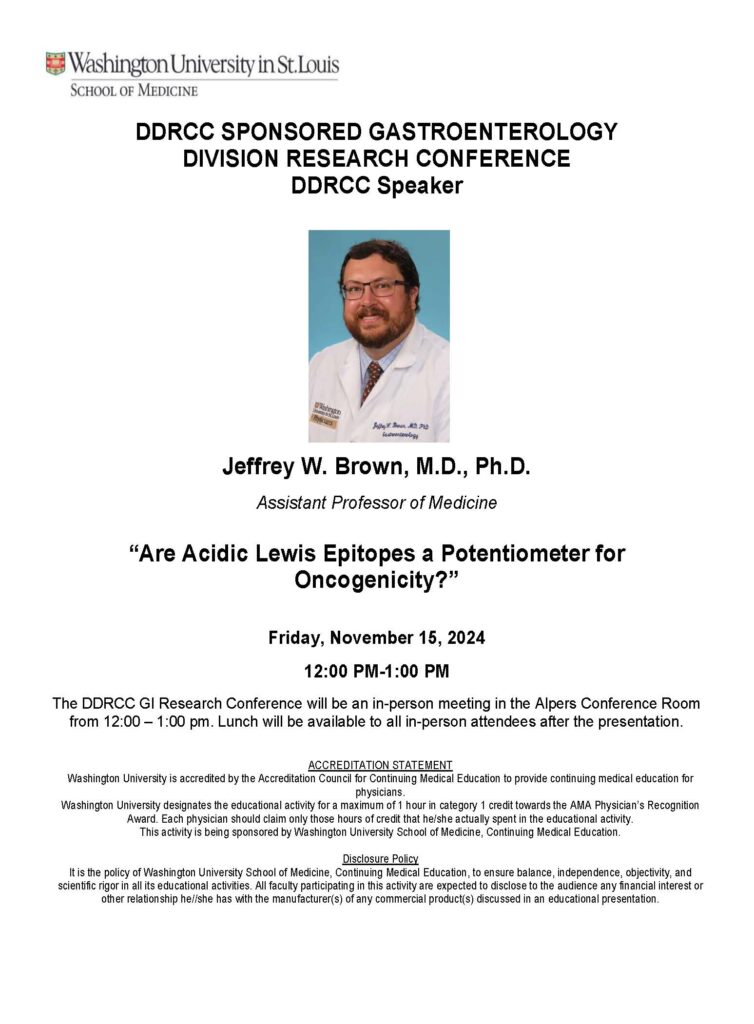 DDRCC Sponsored Gastroenterology Division Research Conference Nov 15, 2024 12:00 p.m.-1:00 p.m. DDRCC Sponsored GI Division Research Conference Alpers Conference Room, Clinical Sciences Research Building, Room 901, 4939 Children's Place, St. Louis, MO 63110 Add to: Google Calendar | Outlook | iCal File