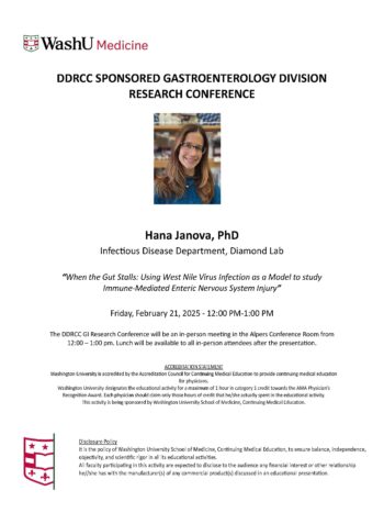 DDRCC Sponsored Gastroenterology Division Research Conference Feb 21, 2025 12:00 p.m.-1:00 p.m. DDRCC Sponsored GI Division Research Conference Alpers Conference Room, Clinical Sciences Research Building, Room 901, 4939 Children's Place, St. Louis, MO 63110 Add to: Google Calendar | Outlook | iCal File