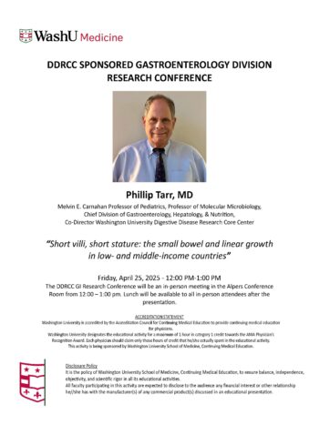DDRCC SPONSORED GASTROENTEROLOGY DIVISION RESEARCH CONFERENCE Apr 25, 2025 12:00 p.m.-1:00 p.m. DDRCC Sponsored GI Division Research Conference Alpers Conference Room, Clinical Sciences Research Building, Room 901, 4939 Children's Place, St. Louis, MO 63110 Add to: Google Calendar | Outlook | iCal File