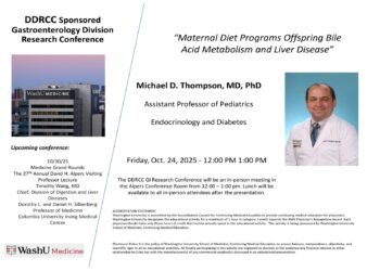 DDRCC Sponsored Gastroenterology Division Research Conference Oct 24, 2025 12:00 a.m.-1:00 a.m. DDRCC Sponsored GI Division Research Conference Alpers Conference Room, Clinical Sciences Research Building, Room 901, 4939 Children's Place, St. Louis, MO 63110 Add to: Google Calendar | Outlook | iCal File