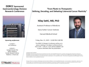 DDRCC Sponsored Gastroenterology Division Research Conference Nov 21, 2025 12:00 p.m.-1:00 p.m. DDRCC Sponsored GI Division Research Conference Alpers Conference Room, Clinical Sciences Research Building, Room 901, 4939 Children's Place, St. Louis, MO 63110 Add to: Google Calendar | Outlook | iCal File