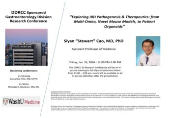 DDRCC Sponsored Gastroenterology Division Research Conference Jan 16, 2026 12:00 p.m.-1:00 p.m. DDRCC Sponsored GI Division Research Conference Alpers Conference Room, Clinical Sciences Research Building, Room 901, 4939 Children's Place, St. Louis, MO 63110 Add to: Google Calendar | Outlook | iCal File